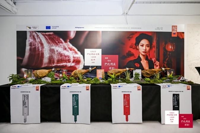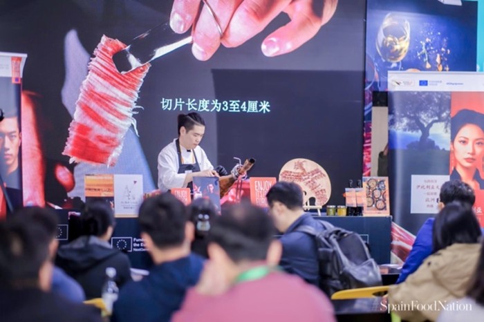 同时,展区也成为了 “唤醒你的伊比利亚感官” 推广项目的展示平台。这一持续了三年的推广项目由伊比利亚猪肉产业联合组织(ASICI)发起,欧盟联合资助,旨在中国市场进行伊比利亚火腿的推广与传播。
