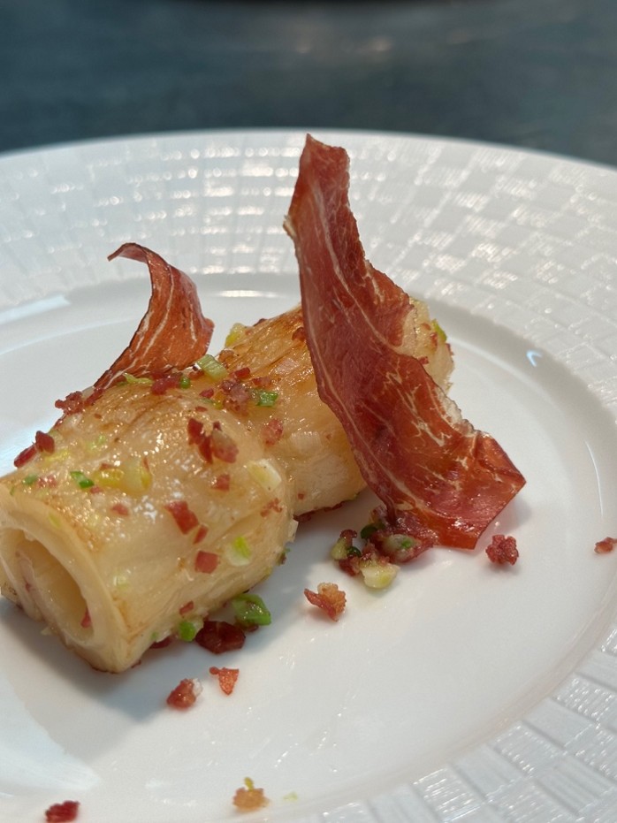 例如这道「伊比利亚火腿葱白煎花胶」,先选用北海公花胶泡发备用,然后把伊比利亚火腿切成碎末,混合葱白碎一起煎花胶。煎的过程当中,加入伊比利亚火腿熬的火腿汁,再加入一点鸡汤,让花胶充分入味,摆盘时放上两片那种烤干的伊比利亚火腿片,增加整体味道的风味和层次。