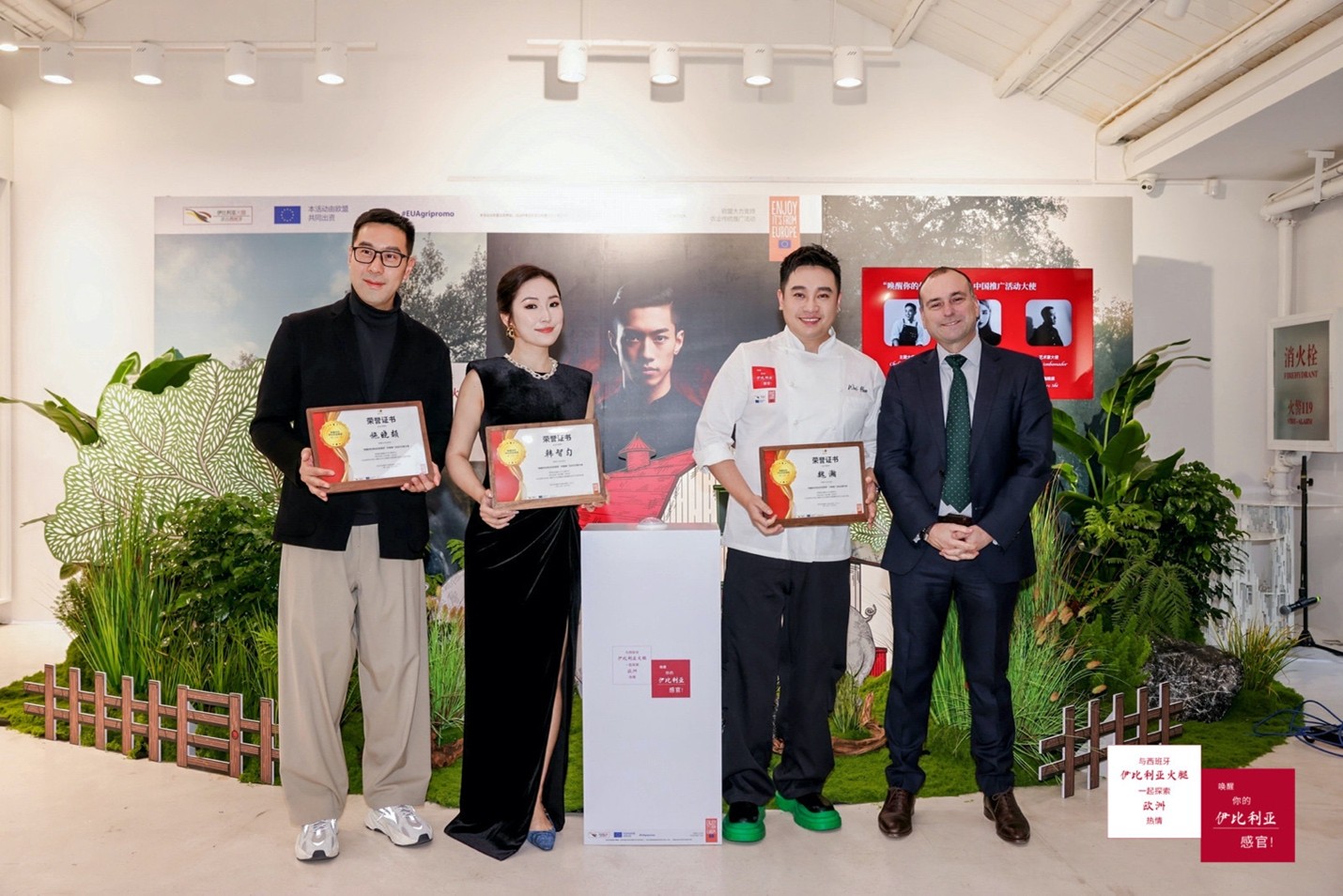不仅如此,“唤醒你的伊比利亚感官”中国推广活动大使也在开幕仪式上荣耀揭晓,知名主厨魏瀚先生被授予主厨大使,导演及摄影师韩智匀女士、插画师施晓颉先生被授予艺术家大使。在到场来宾的见证下,伊比利亚猪肉产业联合组织主席Raúl Garcia先生为三位新晋大使颁发证书并表达了对他们的期待。“祝贺他们成为‘唤醒你的伊比利亚感官’中国推广活动的大使。在与他们的交流中,我深深地感受到了他们对伊比利亚火腿的无限热爱。相信凭借他们在各自领域的影响力,他们一定能通过自己的艺术和美食创作,传递伊比利亚火腿的感官体验。”