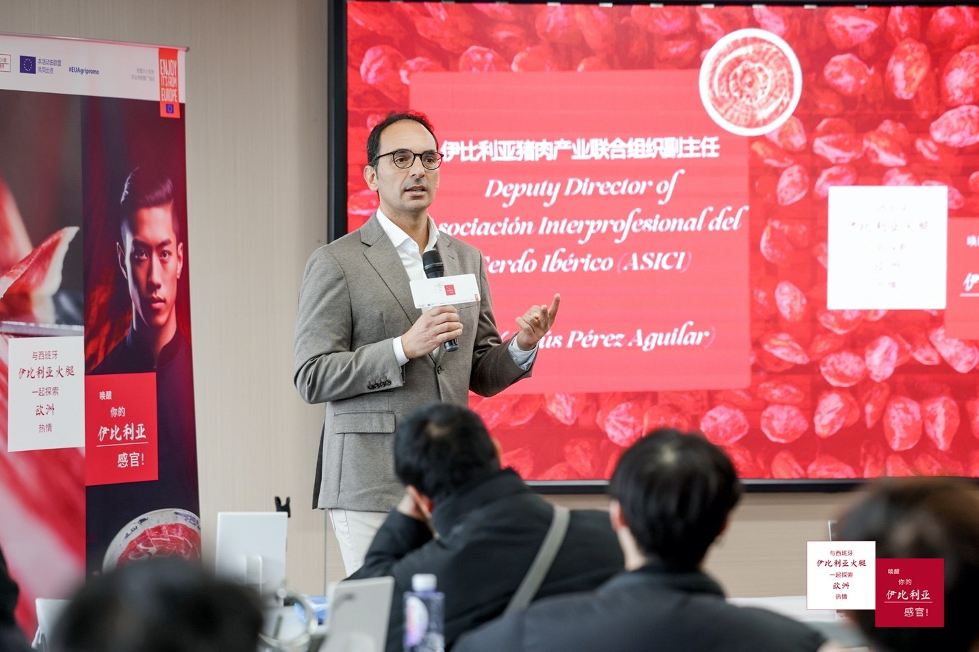 课程开始后,伊比利亚猪肉产业联合组织副主任何苏(Jesús Pérez Aguila)先生率先向学员介绍了正在全球各市场如火如荼开展的伊比利亚火腿推广活动,以及过往三年在欧盟及相关部门支持下所取得的成就。