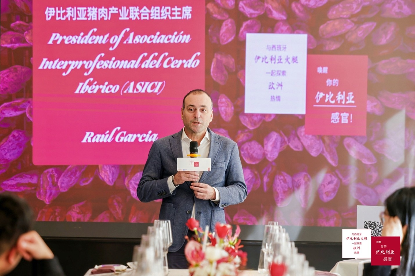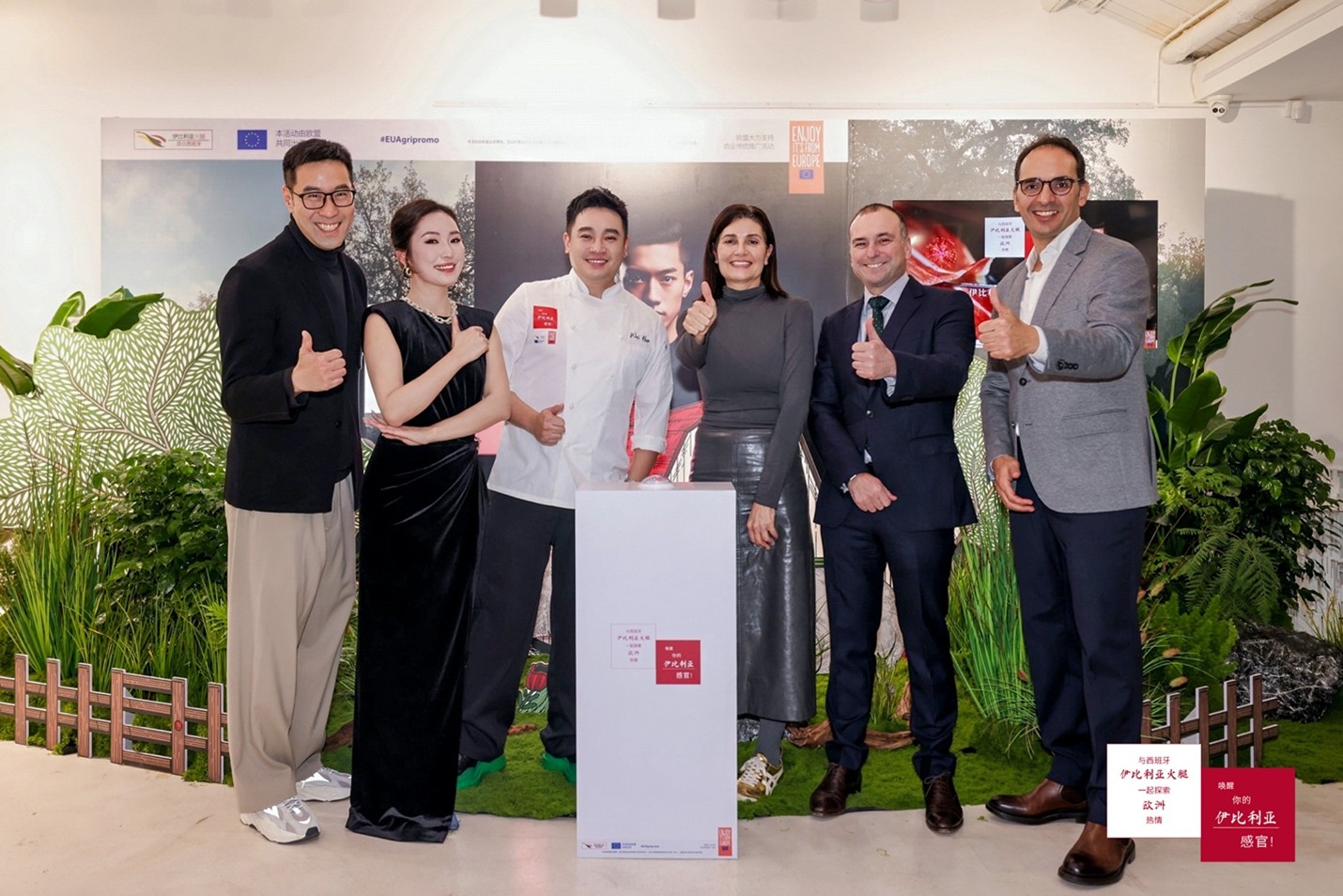 伊比利亚猪肉产业联合组织主席Raúl Garcia先生、副主任何苏(Jesús Pérez Aguila)先生,以及西班牙驻华大使馆代表、西班牙驻上海经济商务领事 Maria Simó 女士出席了当日在上海市中心举办的开幕仪式,共同见证推广项目的启动。