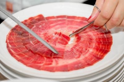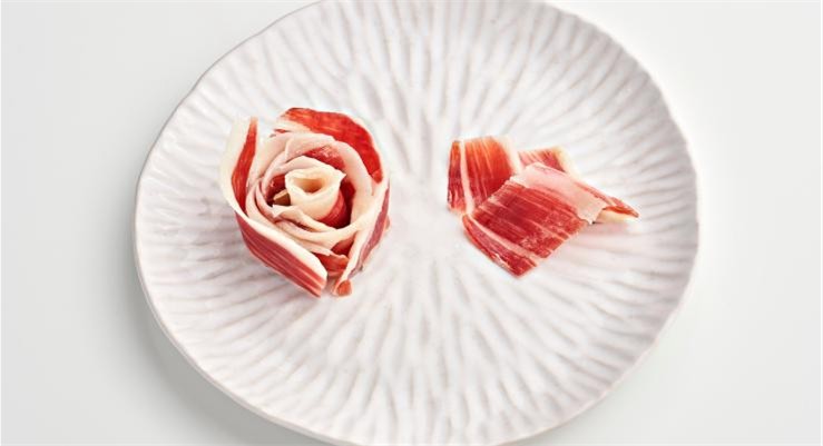 如果你对伊比利亚火腿产生了更进一步的兴趣,不妨在品尝它之前,尝试摆盘的艺术创作。盘子建议选用纯白色的平盘,将选好的火腿切片从盘子外沿开始逐渐向内摆放。在摆放伊比利亚火腿时,创意是必不可少的,你可以尽情发挥想象。另外,食用火腿的理想温度是24 ºC,这样可以保持火腿的香味,使其口感和风味达到最佳状态,因此切记摆盘后不要放置太久再去食用。