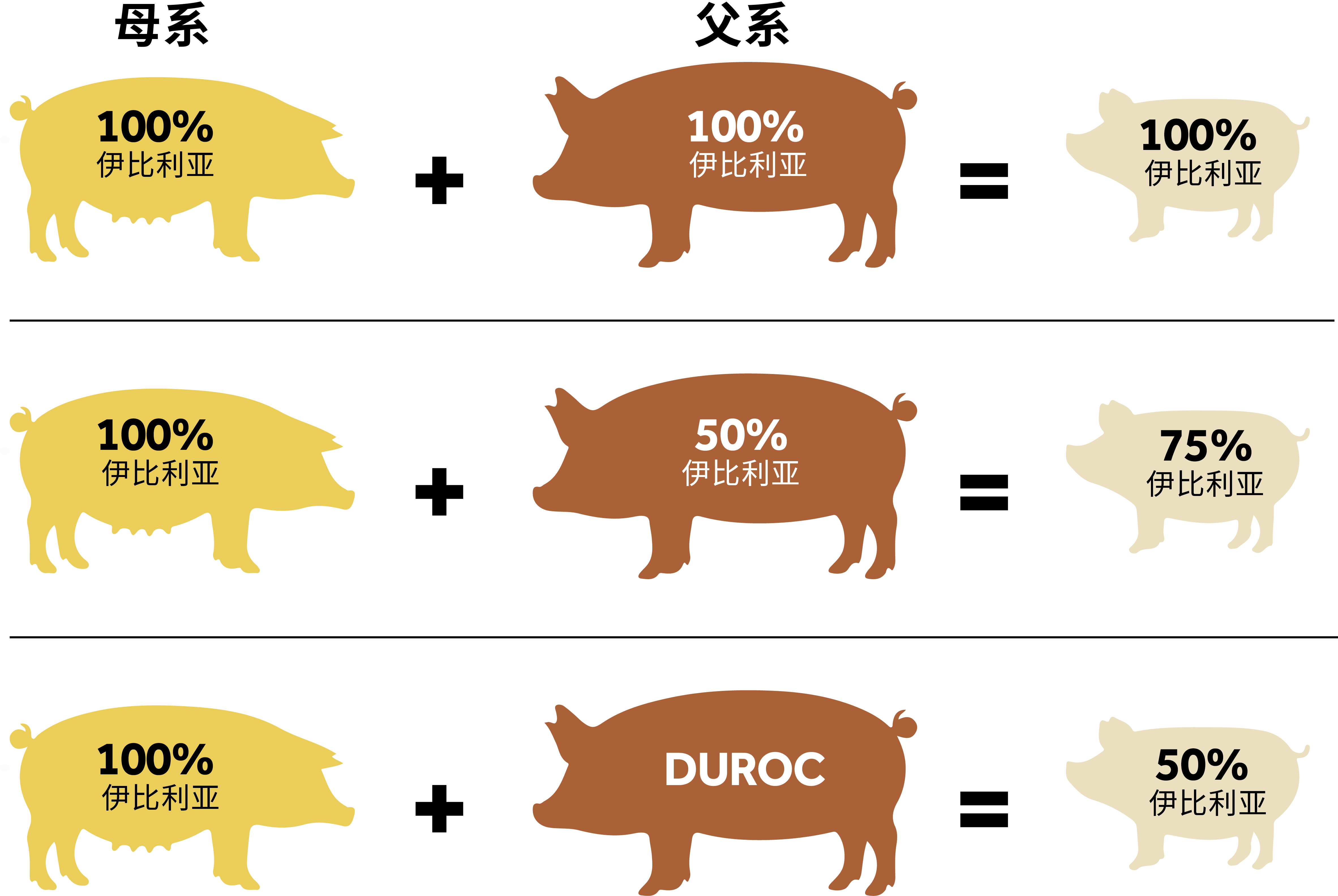 50% 伊比利亚品种:母猪为100%伊比利亚品种,父猪为杜洛克(Duroc)品种,双方均注册于对应的官方血统登记簿。
